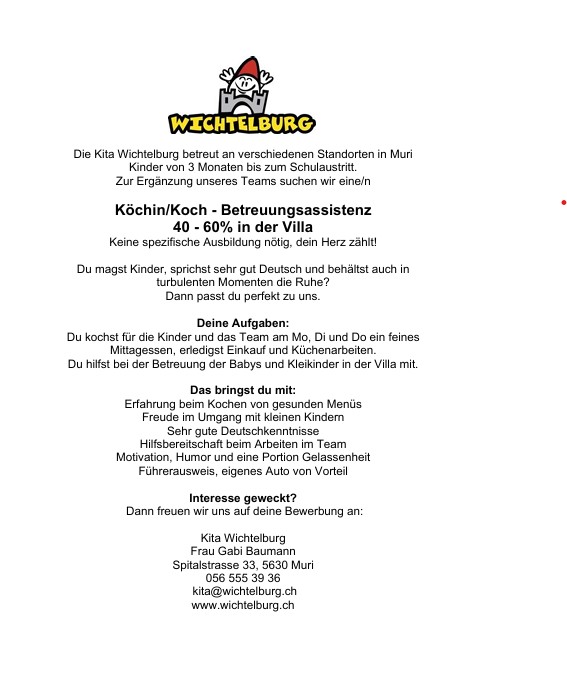 Kita Wichtelburg, MuriInstitutionsleitung: Gabi BaumannAusbildungsverantwortliche: Barbara Nietlispach